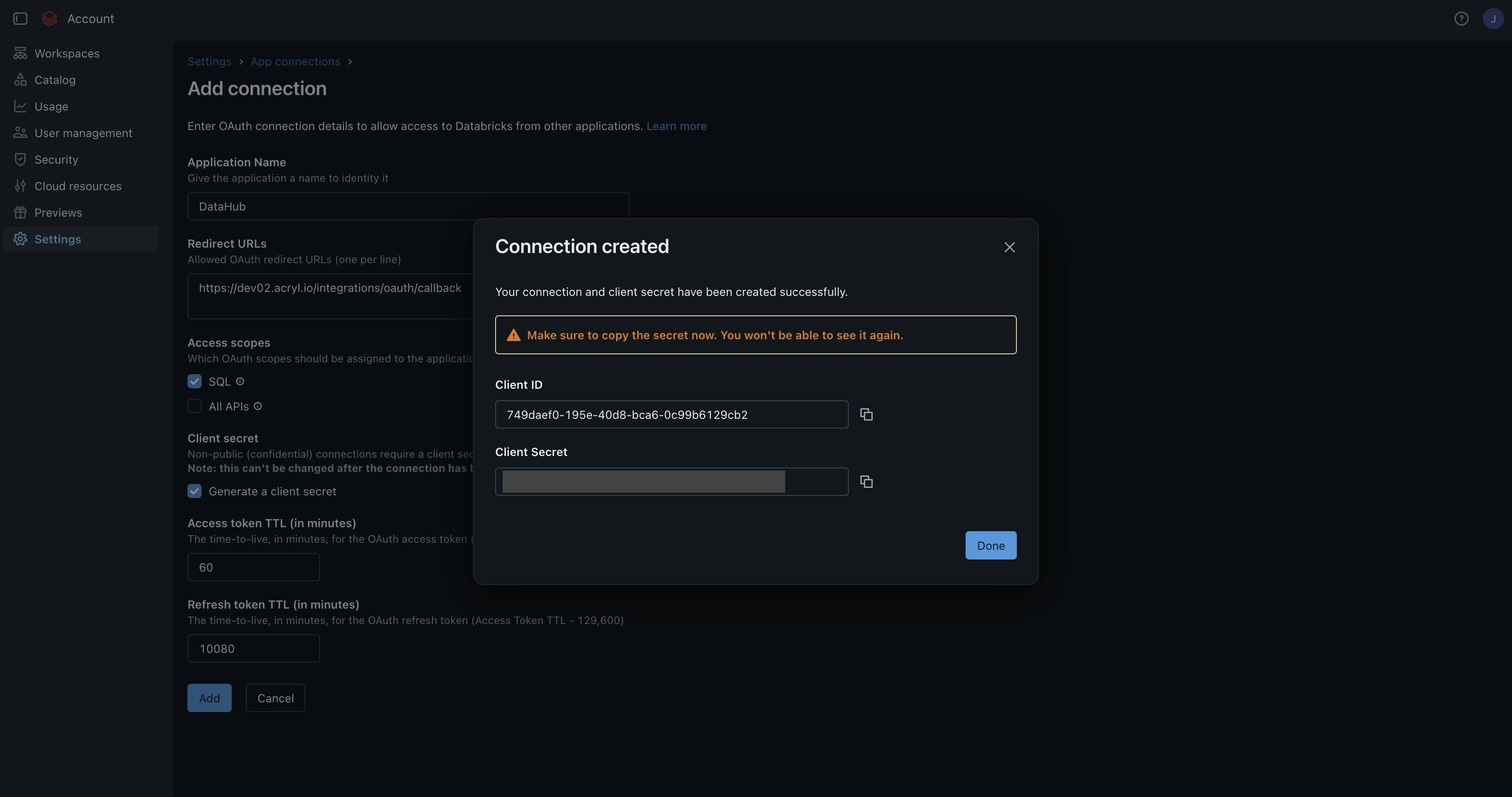After creating the connection, a dialog will show your Client ID and Client Secret. Copy both immediately — the client secret won't be shown again.