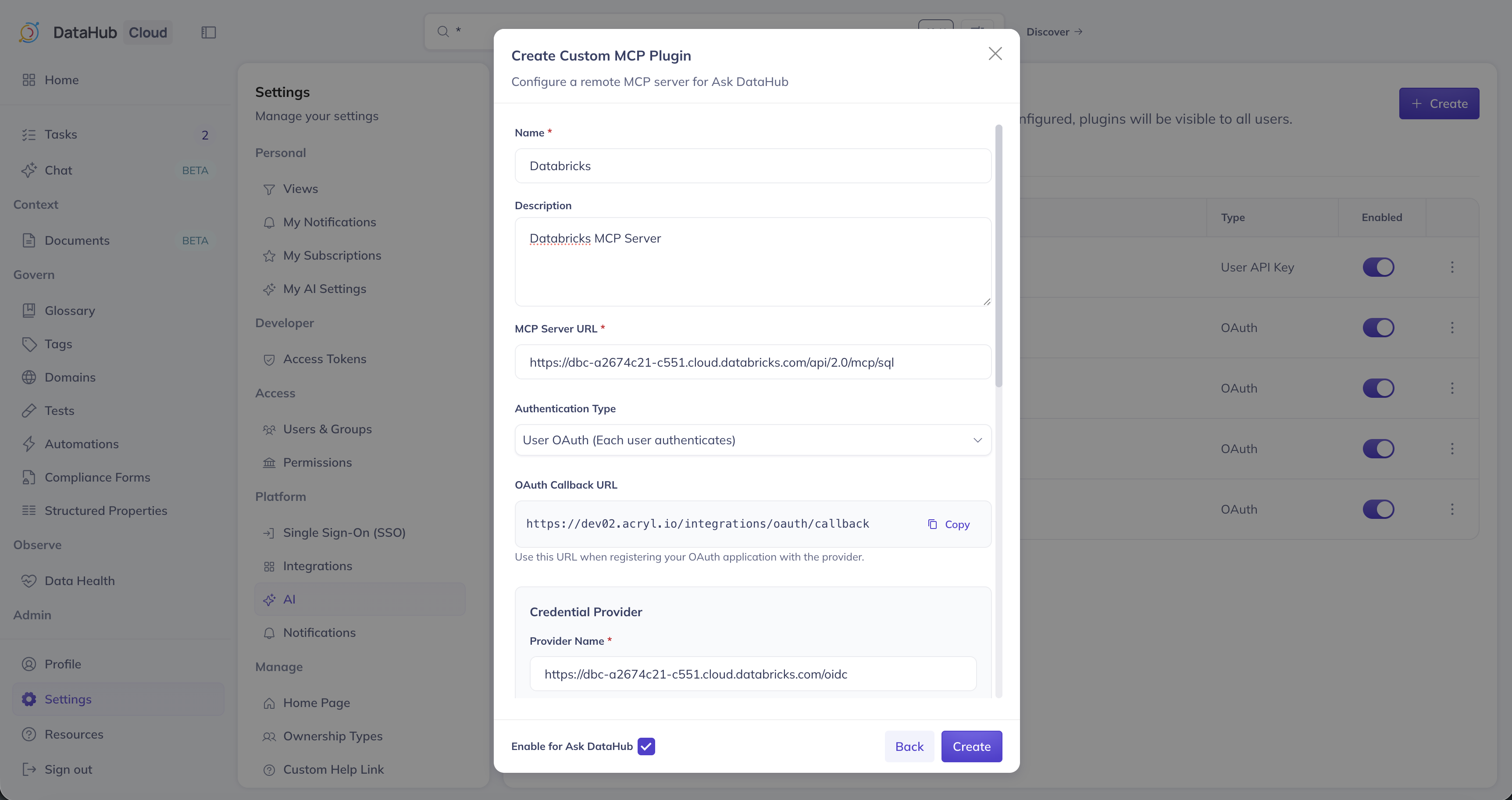 Navigate to Settings > My AI Settings, find the Databricks plugin, and click Connect. You'll be redirected to Databricks to authenticate, then back to DataHub. See the overview for more details.