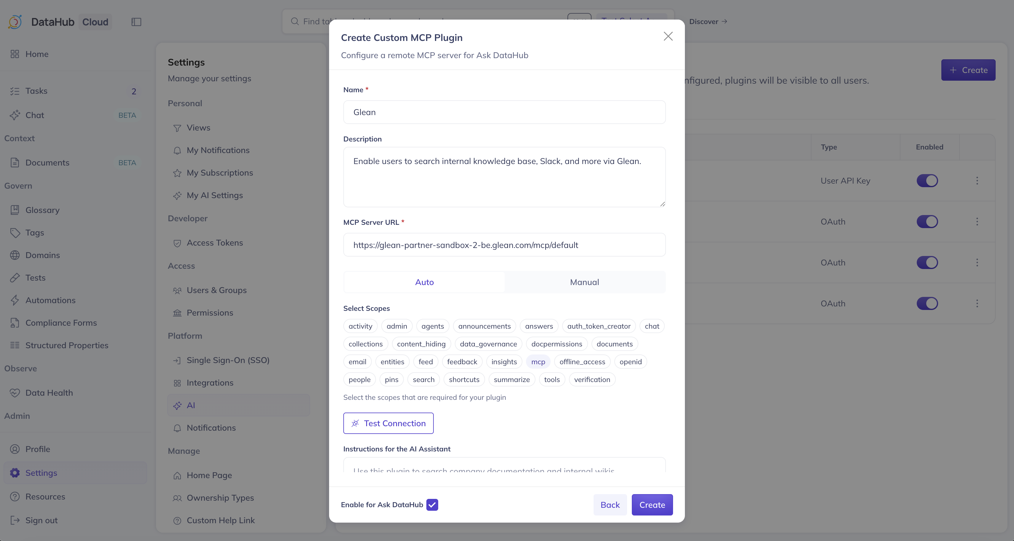The mcp scope must be selected for the Glean plugin to work. Without it, the MCP server will return a 401 Unauthorized error when Ask DataHub tries to use the plugin. If you see this error after setup, edit the plugin and verify that the mcp scope is enabled.