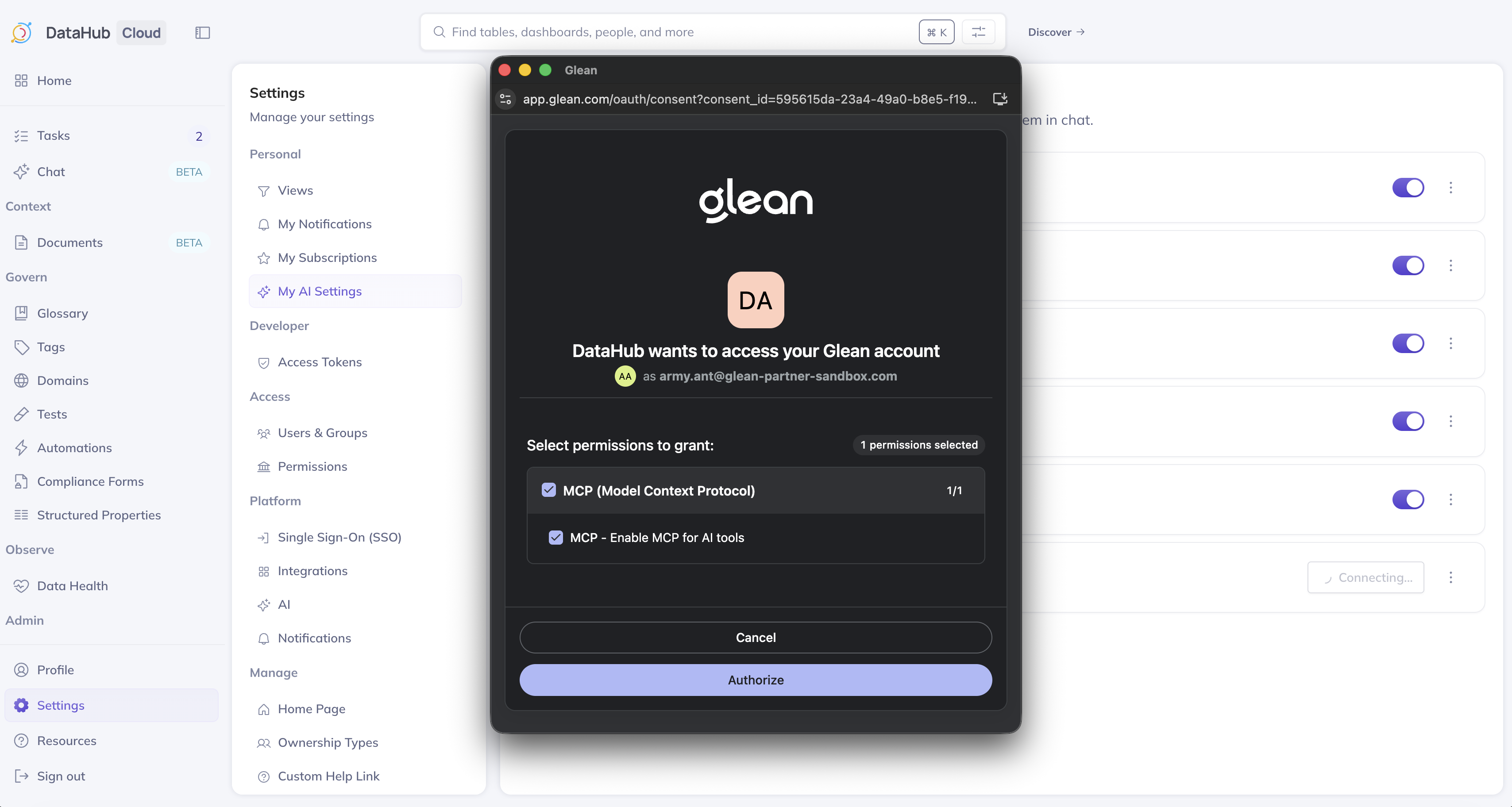 Navigate to Settings > My AI Settings, find the Glean plugin, and click Connect. You'll be redirected to Glean to authenticate, then back to DataHub. See the overview for more details.