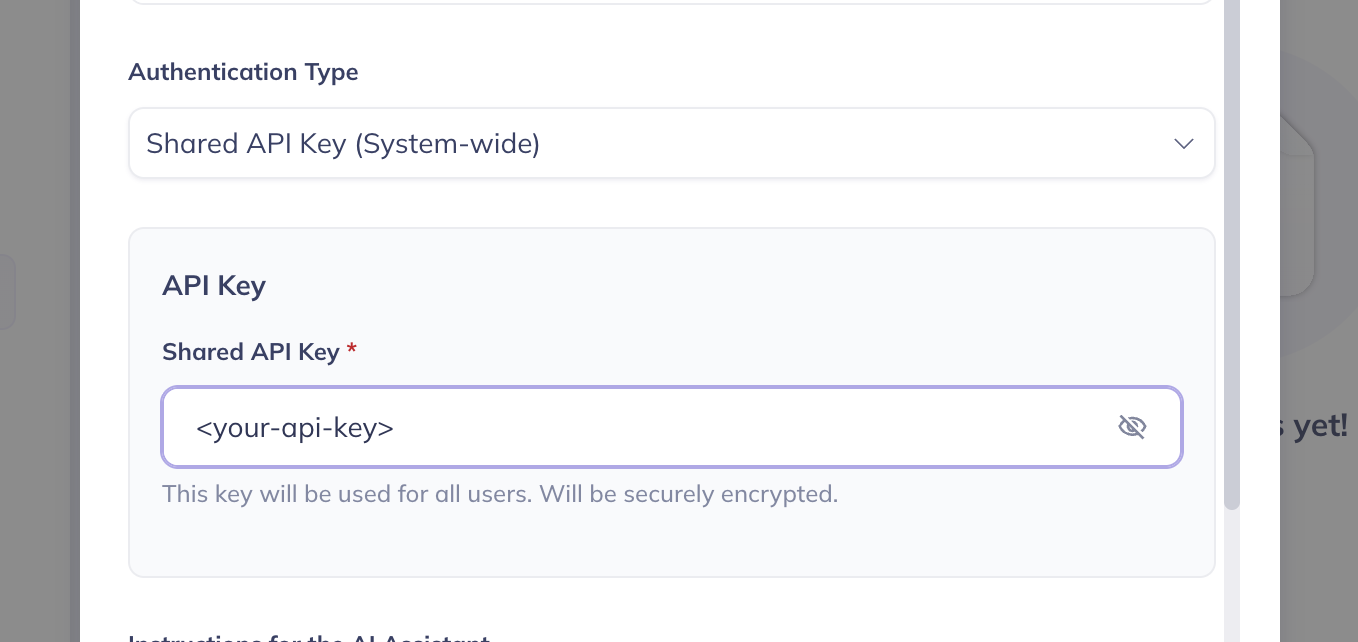 A single API key shared across all users. The admin provides the key during setup, and it is used for every user's requests. Best for tools where a single service account is appropriate.