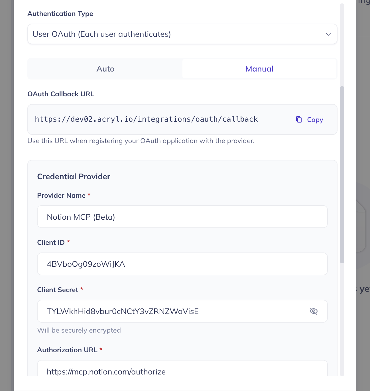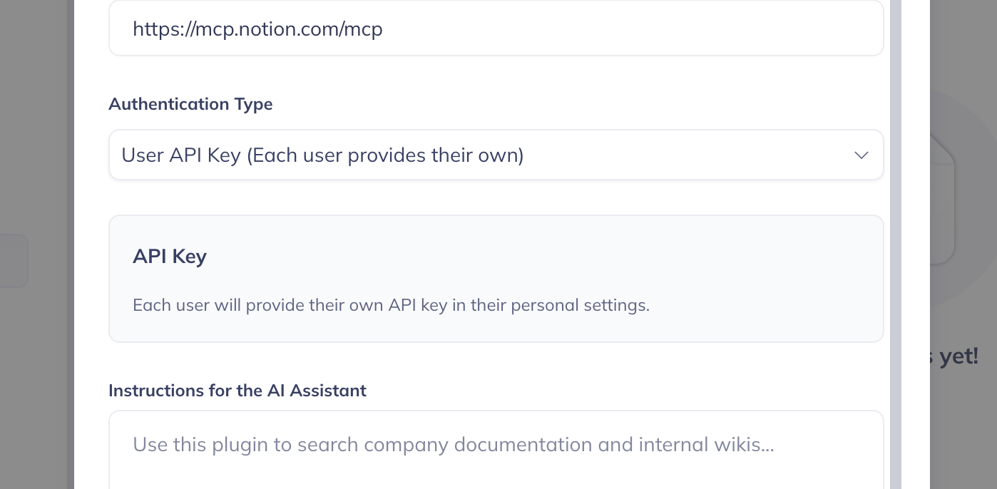 Use Custom MCP to connect any MCP-compatible server — whether it's a third-party tool like Notion or Glean, an internal service your team has built, or any other API exposed via MCP. The server must support Streamable HTTP transport.