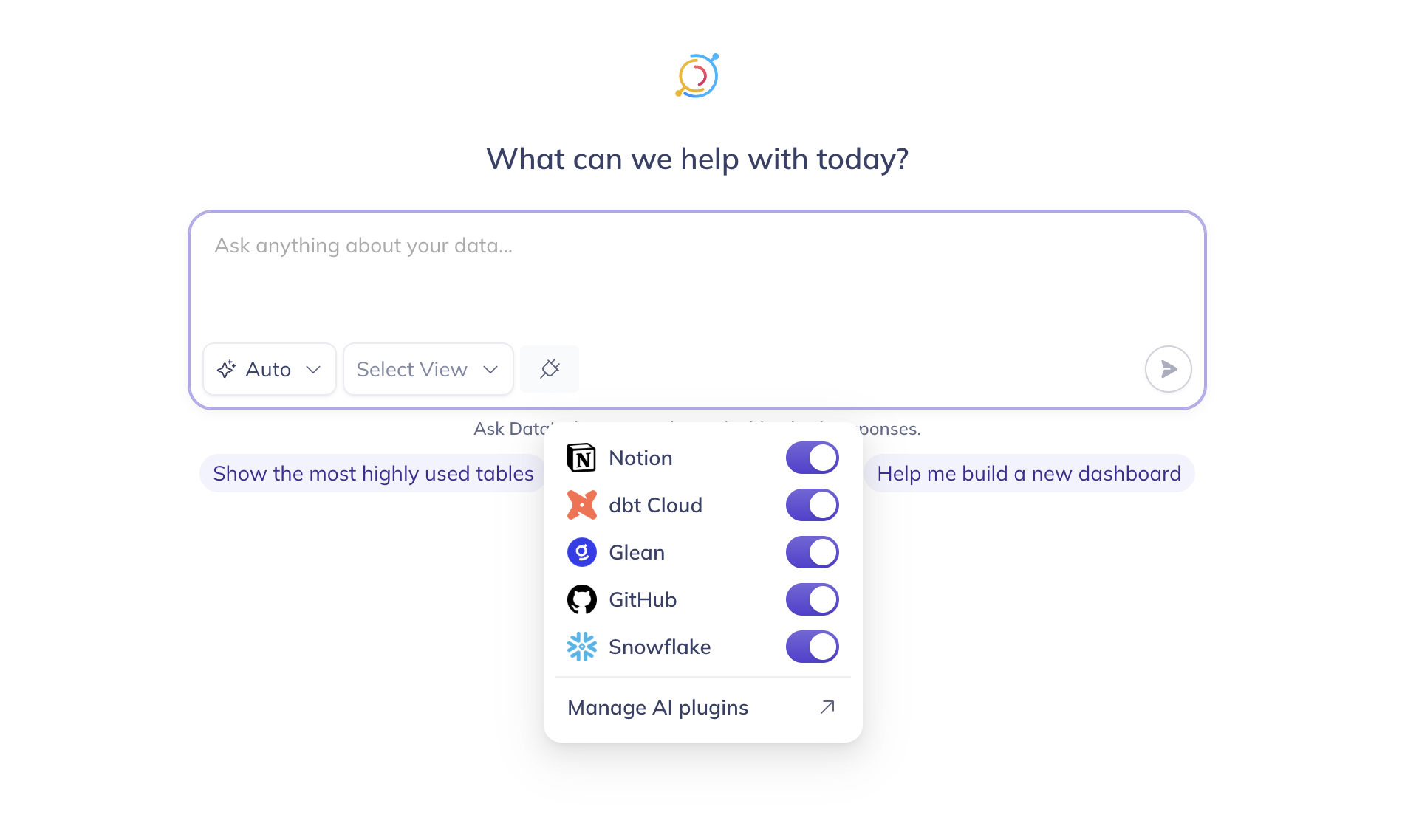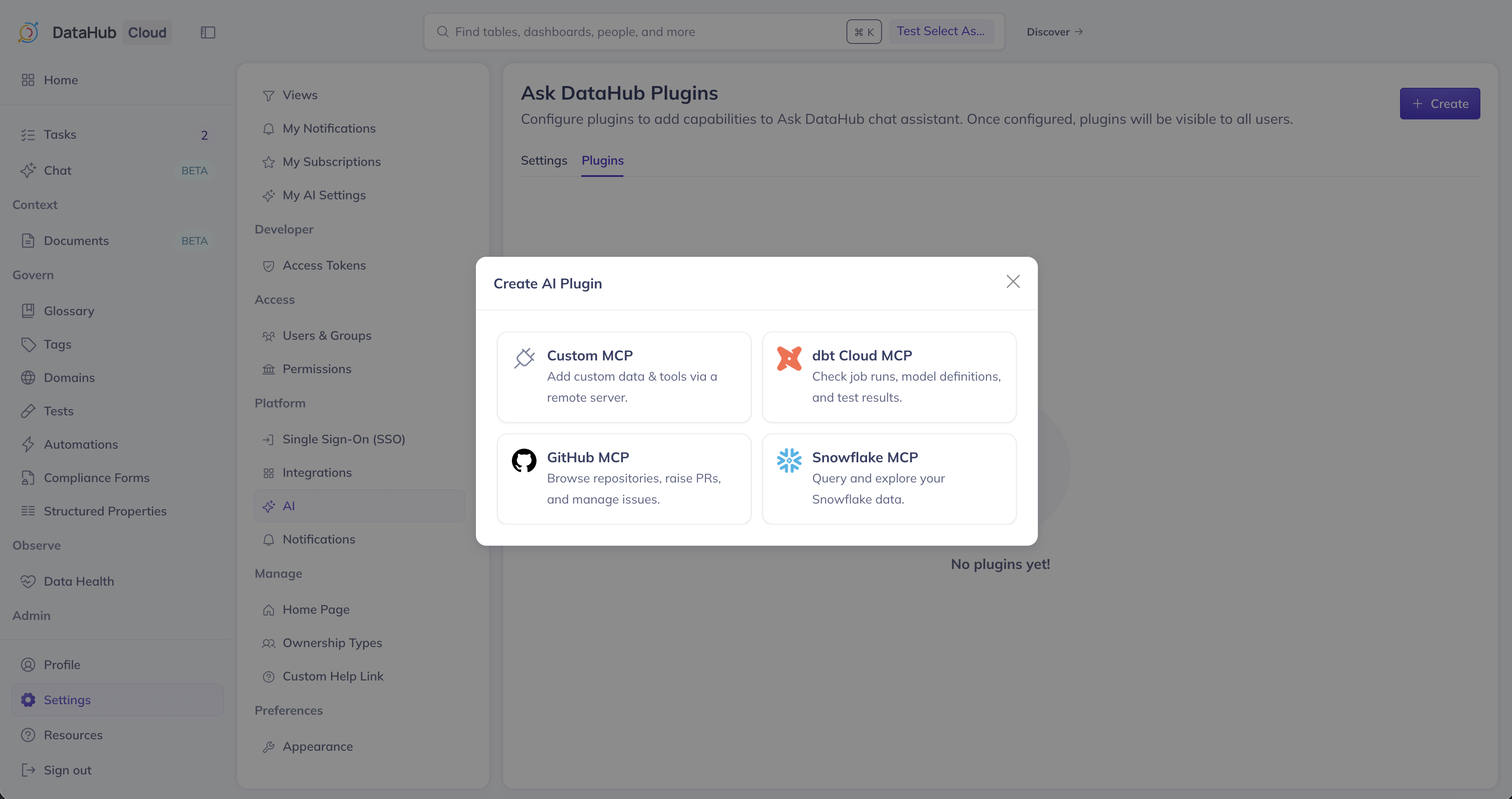 Ask DataHub Plugins let you connect external tools — like Snowflake, Databricks, BigQuery, dbt Cloud, GitHub, Glean, and more — directly into Ask DataHub via the Model Context Protocol (MCP).