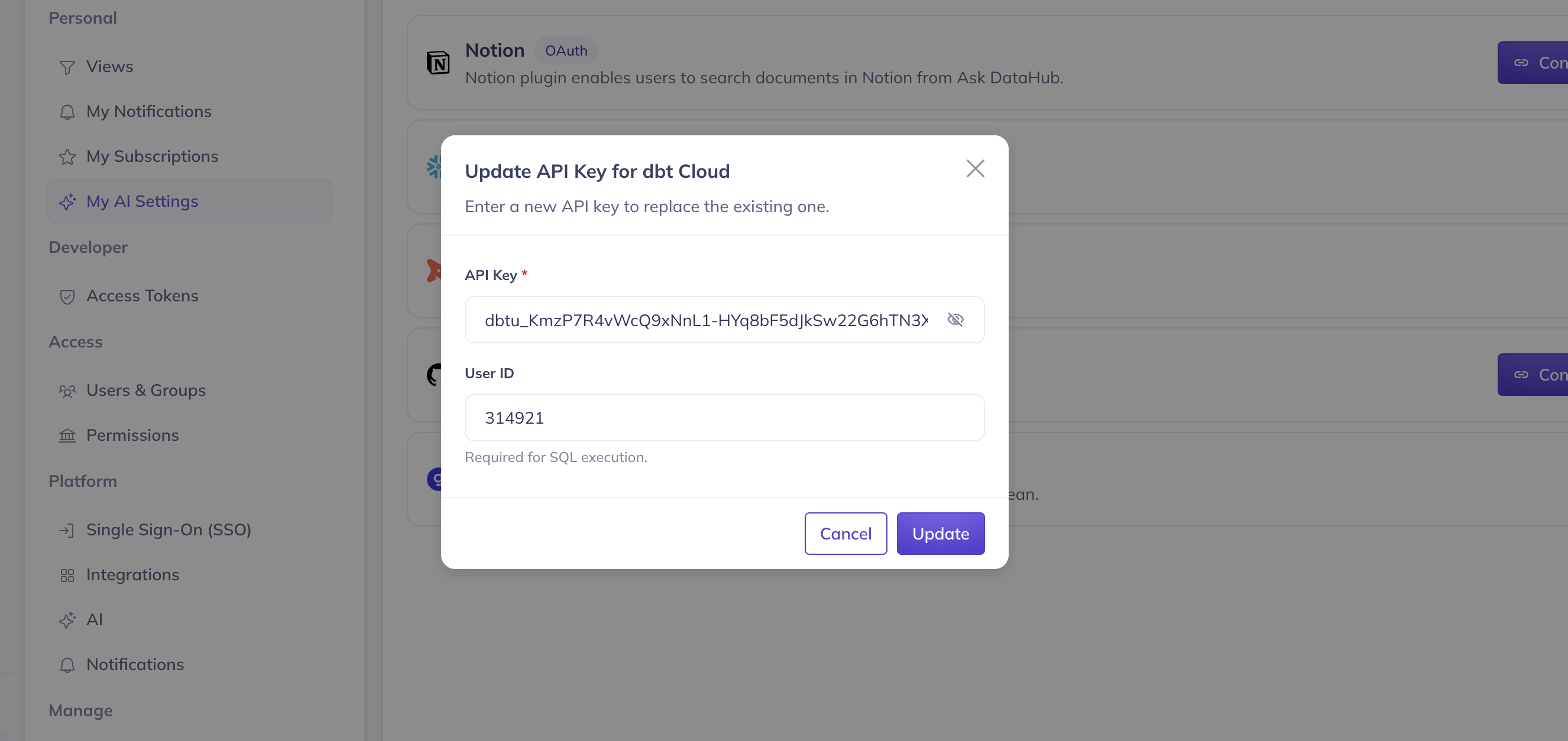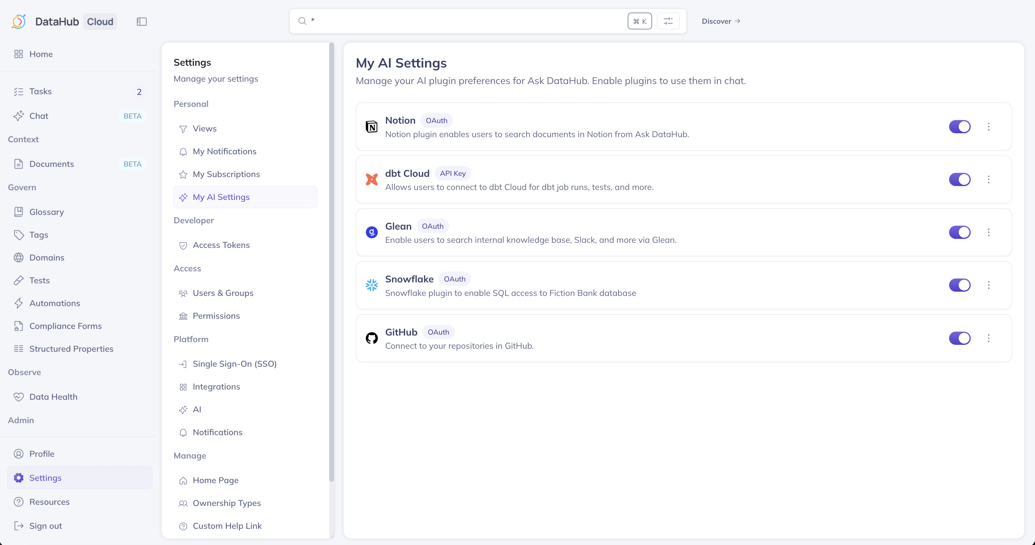 Once an admin has configured a plugin, any user can enable it for their own Ask DataHub experience.