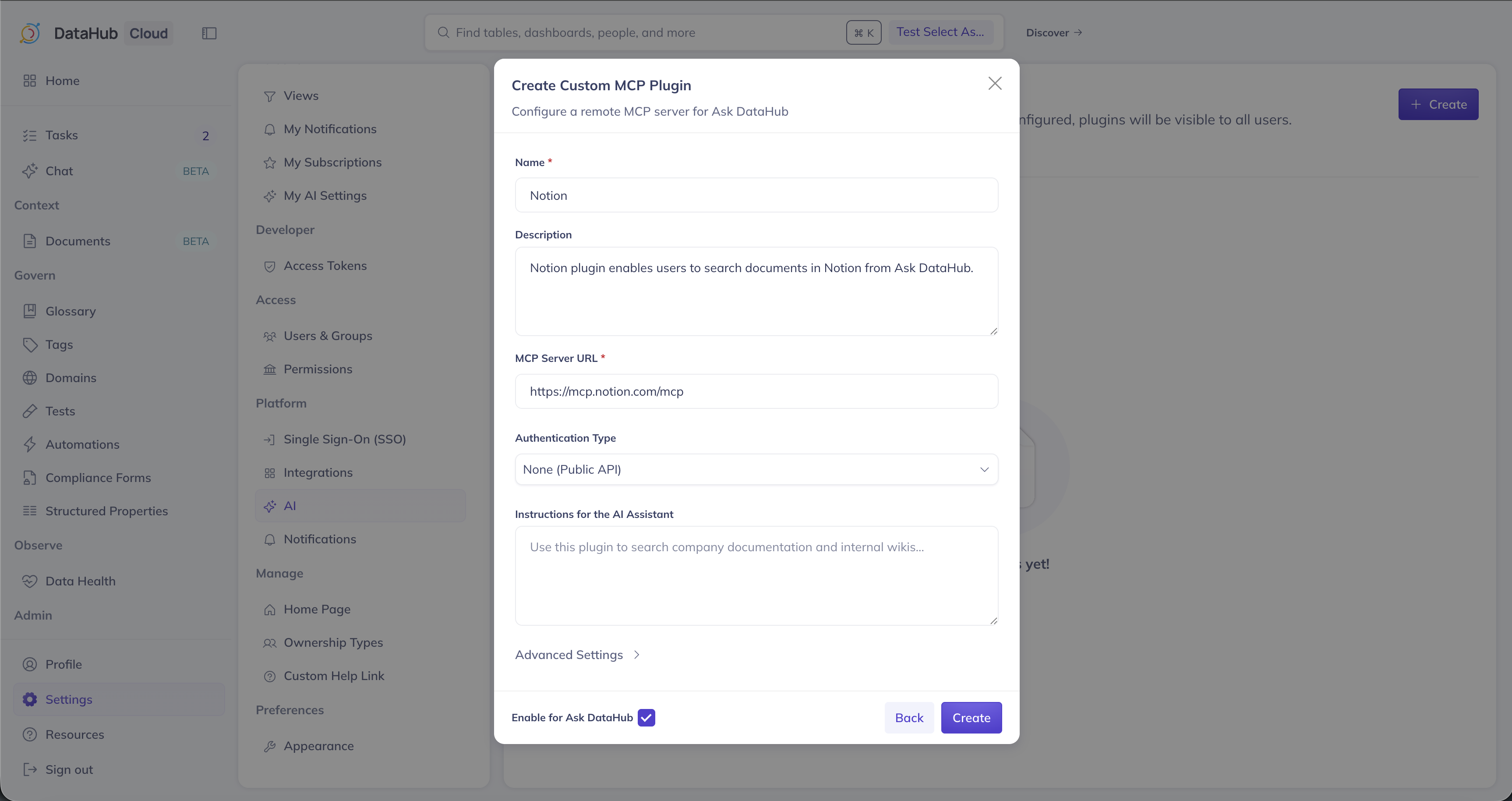 | Instructions for the AI Assistant | Custom instructions fed to Ask DataHub when using this plugin (optional) |