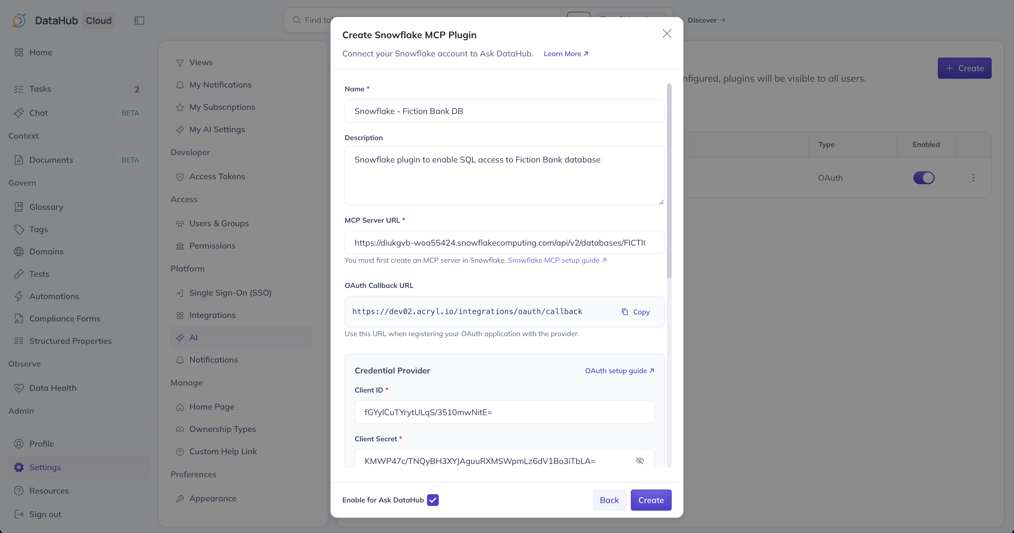 The OAUTH_REDIRECT_URI must match the OAuth Callback URL shown in the DataHub plugin creation form exactly (e.g. https://your-org.acryl.io/integrations/oauth/callback). You can copy this URL from the form when creating the plugin in Step 5.